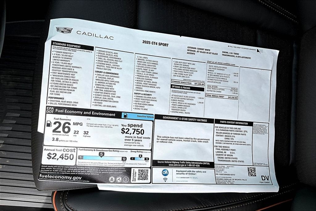 Summit White 2025 Cadillac CT4 2.0L Turbocharged 8-Speed Automatic RWD Sport New Feature 3, New Feature 4, 4-Wheel Disc Antilock Brakes, 8 Speakers, All-Weather Cargo Mat (LPO), All-Weather Floor Mats, AM/FM radio: SiriusXM with 360L, Climate Package, Driver Power Lumbar Massage Seat, Dual Digital Driver Information Center Display, Front Passenger Power Lumbar Massage Seat, HD Radio, HD Rear Vision Camera, Heated Driver & Front Passenger Seats, Heated Steering Wheel, Interior Protection Package (LPO), Leather-Wrapped Thick Rim Steering Wheel, LED Reflective Windshield Collision Alert, Preferred Equipment Group 1SE, Premium 8-Speaker Audio System Feature, Radio data system, Radio: Cadillac User Experience, SiriusXM w/360L Trial Subscription, Ventilated Driver & Front Passenger Seats.