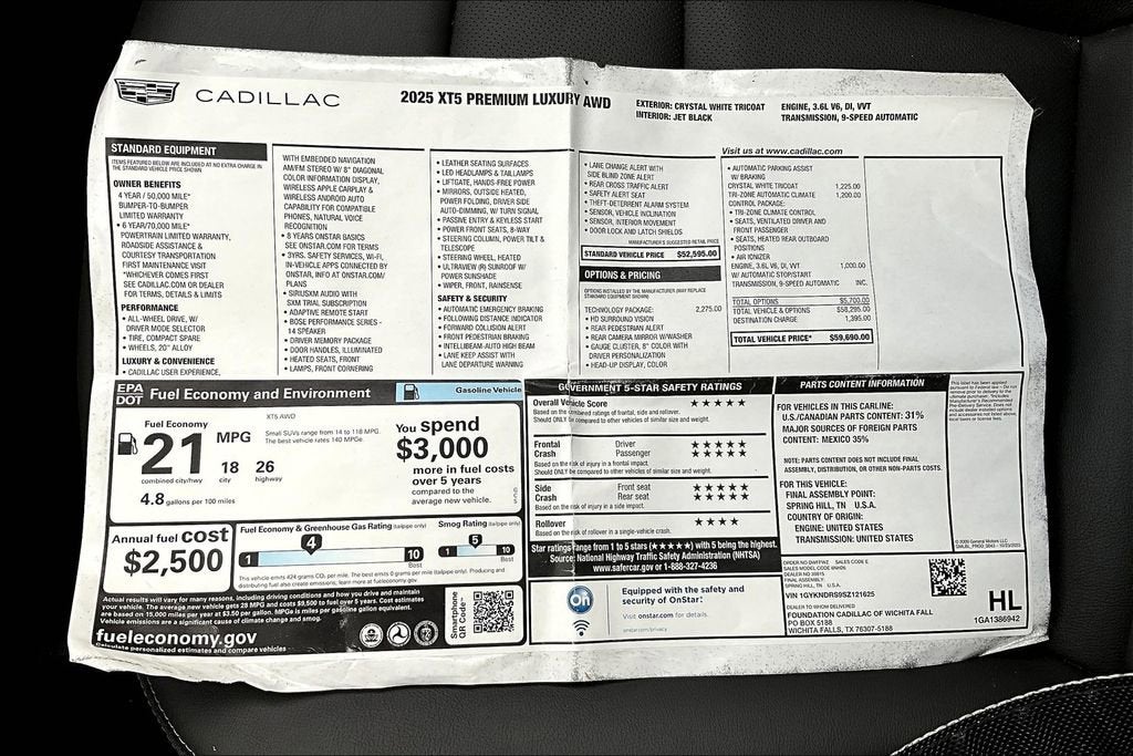 Crystal White Tricoat 2025 Cadillac XT5 3.6L V6 DI VVT 9-Speed Automatic AWD Premium Luxury 8 Color Driver Info Center Display Gauge Cluster, Automatic Parking Assist w/Braking, HD Surround Vision, Head-Up Display, Rear Camera Mirror, Rear Camera Mirror Washer, Rear Pedestrian Alert, Technology Package.