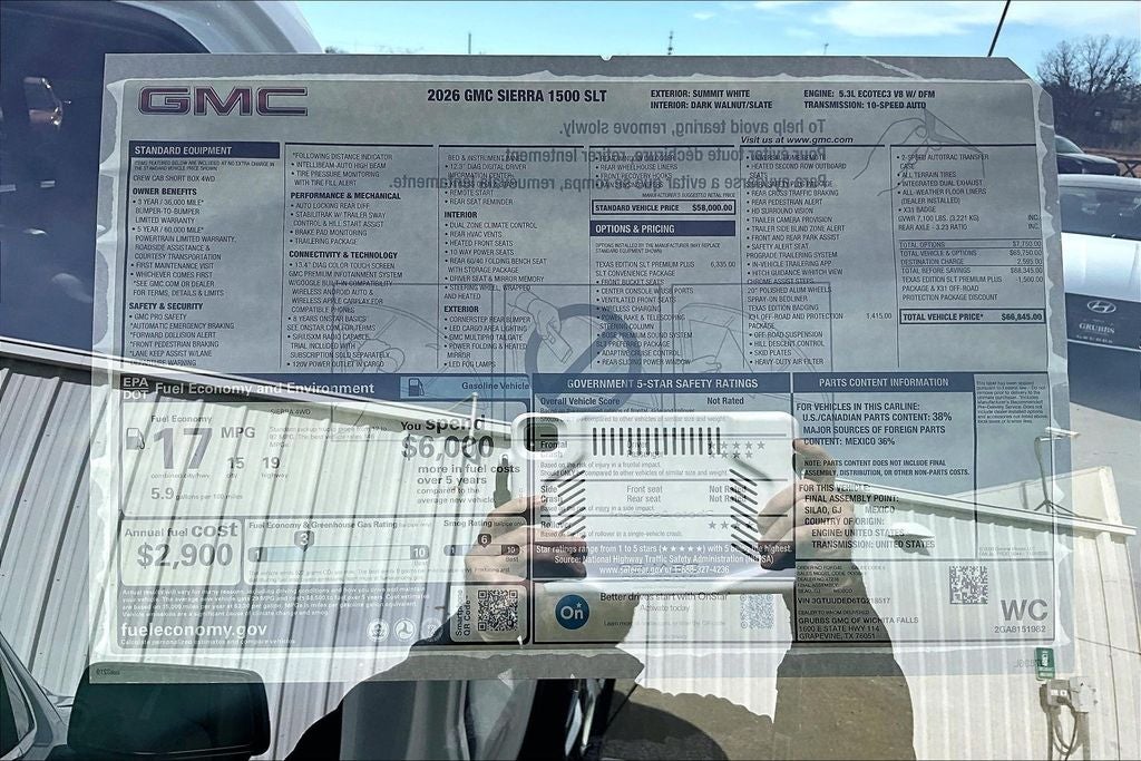 Summit White 2026 GMC Sierra 1500 EcoTec3 5.3L V8 10-Speed Automatic 4WD SLT 10-Speed Automatic, 4WD, Dark Walnut/Slate Leather.