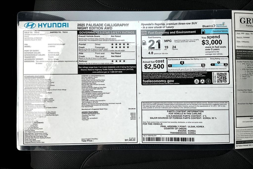 With a city MPG of 19 and a highway MPG of 24, this Palisade delivers exceptional efficiency without compromising power or capability. The Calligraphy Night Edition's sophisticated Microfiber Suede Seat Trim and premium amenities create an unparalleled driving experience.