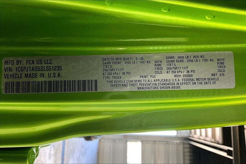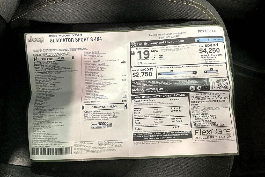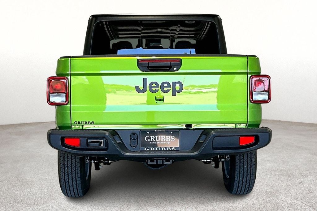 2025 Jeep Gladiator Sport S 4D Crew Cab Sport S Mojito 4WD 8-Speed Automatic 3.6L V6 24V VVT 110 MPH Vehicle Max Speed Calibration, 12.3 Touchscreen Display, 4-Wheel Disc Brakes, 4G LTE Wi-Fi Hot Spot, 8 Speakers, ABS brakes, Advanced Brake Assist, Air Conditioning, Alexa Built-In, AM/FM radio: SiriusXM, Apple CarPlay, Apple CarPlay/Android Auto, Automatic Headlamps, Body Color Fender Flares (2-Piece), Compass, Connectivity - US/Canada, Convenience Group, Corning Gorilla Glass, Dark Sky Appearance Package, Daytime Running Lamp System, Deep Tint Sunscreen Windows, Delay-off headlights, Driver door bin, Dual front impact airbags, Dual front side impact airbags, Emergency/Assistance Call, Enhanced Adaptive Cruise Control, Front anti-roll bar, Front Door Locks 2-Door Passive Entry, Front License Plate Bracket, Full Speed Forward Collision Warning Plus, Heated Front Seats, Heated Steering Wheel, Low tire pressure warning, Mold In Color Bumper w/Gloss Black, Normal Duty Plus Suspension, Normal Duty Suspension, Panic alarm, Performance Hood, Power Heated Mirrors, Power steering, Power windows, Premium Wrapped Steering Wheel, Quick Order Package 24S Sport S, Radio data system, Radio: Uconnect 5 w/12.3 Display, Rear Window Defroster, Remote keyless entry, Remote Start System, Security Alarm, Speed control, Split folding rear seat, Steering wheel mounted audio controls, Sun Visors w/Illuminated Vanity Mirrors, Traction control, Universal Garage Door Opener, Wheels: 17 x 7.5 Gray.