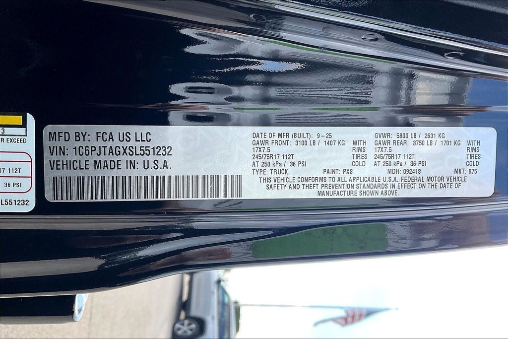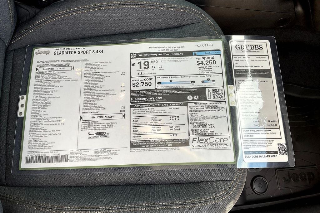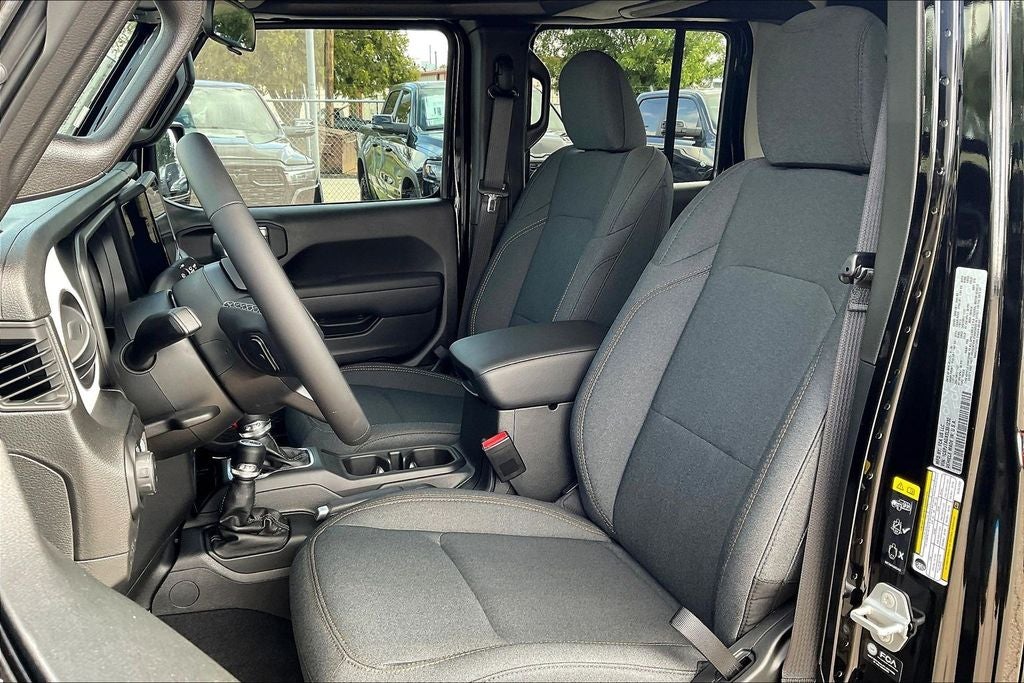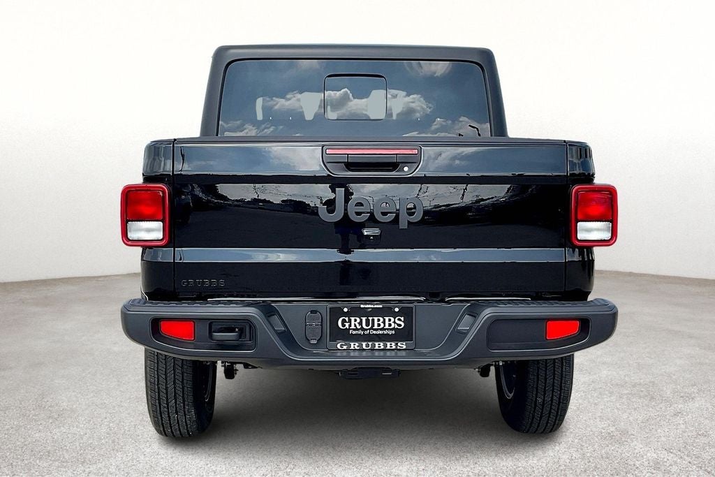 2025 Jeep Gladiator Sport S 4D Crew Cab Sport S Black Clearcoat 4WD 8-Speed Automatic 3.6L V6 24V VVT Gladiator Sport S, 4D Crew Cab, 3.6L V6 24V VVT, 8-Speed Automatic, 4WD, Black Clearcoat, Black Cloth, 110 MPH Vehicle Max Speed Calibration, 12.3 Touchscreen Display, 4-Wheel Disc Brakes, 4G LTE Wi-Fi Hot Spot, 8 Speakers, ABS brakes, Advanced Brake Assist, Air Conditioning, Alexa Built-In, AM/FM radio: SiriusXM, Apple CarPlay, Apple CarPlay/Android Auto, Automatic Headlamps, Black 3-Piece Hard Top, Body Color Fender Flares (2-Piece), Brake assist, Compass, Connectivity - US/Canada, Convenience Group, Corning Gorilla Glass, Dark Sky Appearance Package, Daytime Running Lamp System, Deep Tint Sunscreen Windows, Delay-off headlights, Driver door bin, Driver vanity mirror, Dual front impact airbags, Electronic Stability Control, Emergency/Assistance Call, Enhanced Adaptive Cruise Control, Freedom Panel Storage Bag, Front Door Locks 2-Door Passive Entry, Front fog lights, Front License Plate Bracket, Full Speed Forward Collision Warning Plus, Heated Front Seats, Heated Steering Wheel, Low tire pressure warning, Mold In Color Bumper w/Gloss Black, Normal Duty Plus Suspension, Normal Duty Suspension, Outside temperature display, Overhead airbag, Panic alarm, ParkView Rear Back-Up Camera, Passenger vanity mirror, Performance Hood, Power Heated Mirrors, Power steering, Power windows, Premium Wrapped Steering Wheel, Quick Order Package 24S Sport S, Radio data system, Radio: Uconnect 5 w/12.3 Display, Rear reading lights, Rear Sliding Window, Rear Window Defroster, Remote keyless entry, Remote Start System, Security Alarm, Speed control, Sun Visors w/Illuminated Vanity Mirrors, Tachometer, Telescoping steering wheel, Tilt steering wheel, Traction control, Trip computer, Universal Garage Door Opener, USB Host Flip, Wheels: 17 x 7.5 Gray.