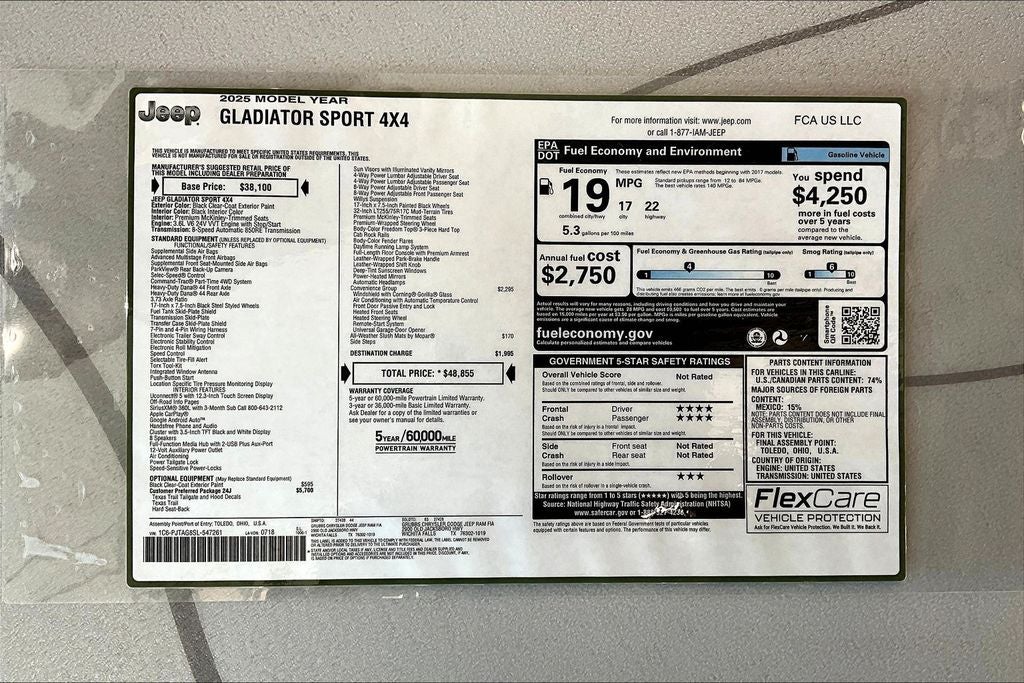 2025 Jeep Gladiator Texas Trail 4D Crew Cab Texas Trail Black Clearcoat 4WD 8-Speed Automatic 3.6L V6 24V VVT CUSTOM, LIFTED, WHEELS AND TIRES, Gladiator Texas Trail, 4D Crew Cab, 3.6L V6 24V VVT, 8-Speed Automatic, 4WD, Black Clearcoat, Black Cloth, 8 Speakers, 97 MPH Vehicle Max Speed Calibration, Advanced Brake Assist, Air Conditioning, AM/FM radio: SiriusXM, Automatic Headlamps, Body Color 3-Piece Hard Top, Body Color Fender Flares (2-Piece), Convenience Group, Corning Gorilla Glass, Daytime Running Lamp System, Deep Tint Sunscreen Windows, Emergency/Assistance Call, Freedom Panel Storage Bag, Front Door Locks 2-Door Passive Entry, Full Length Floor Console Premium Armrest, Full Speed Forward Collision Warning Plus, Hard Seat Back, Heated Front Seats, Heated Steering Wheel, Integrated Radar Camera Module (IRCM), Leather Wrapped Park Brake Handle, Leather Wrapped Shift Knob, Power 4-Way Driver Lumbar Adjust, Power 4-Way Passenger Lumbar Adjust, Power Adjust 8-Way Driver Seat, Power Adjust 8-Way Front Passenger Seat, Power Heated Mirrors, Power steering, Power windows, Premium Door Trim Panel, Premium McKinley Trimmed Seats, Premium Wrapped Steering Wheel, Quick Order Package 24J Texas Trail, Radio data system, Radio: Uconnect 5 w/12.3 Display, Rear Armrest w/Cupholder Seat, Rear Sliding Window, Rear Window Defroster, Remote keyless entry, Remote Start System, Security Alarm, Sun Visors w/Illuminated Vanity Mirrors, Texas Trail, Texas Trail Tailgate & Hood Decals, Universal Garage Door Opener, Wheels: 17 x 7.5 Painted Black, Willys Suspension.