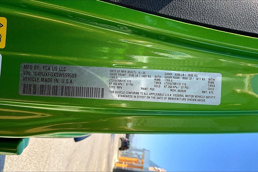 2025 Jeep Wrangler Rubicon X 4D Sport Utility Rubicon X Mojito Clearcoat 4WD 8-Speed Automatic 3.6L V6 24V VVT 12.3 Touchscreen Display, 35 Tire Suspension, 4.56 Rear Axle Ratio, 4G LTE Wi-Fi Hot Spot, 8 Speakers, 97 MPH Vehicle Max Speed Calibration, Acoustic Front Seat Area Carpet, Acoustic Laminated Front Door Glass, Air Conditioning, Alpine Premium Audio System, AM/FM radio: SiriusXM, Anti-Lock 4-Wheel Disc Perf Brakes, Apple CarPlay, Auto High Beam Headlamp Control, Auto-Dimming Rear-View Mirror, Automatic temperature control, Auxiliary Switches, Blind Spot & Cross Path Detection, Body Color 3-Piece Hard Top, Body Color Rubicon Highline Flare, Class II Receiver Hitch, Connected Travel & Traffic Services, Connectivity - US/Canada, Convenience Group, Freedom Panel Storage Bag, Front dual zone A/C, Google Android Auto, GPS Navigation, HD Radio, Heated Front Seats, Heated Steering Wheel, Integrated Off-Road Camera, Integrated Voice Command w/Bluetooth®, Leather Wrapped Park Brake Handle, Leather Wrapped Shift Knob, MOPAR Hardtop Headliner, MOPAR Hinge-Gate Reinforcement, Nappa Leather Seats, ParkSense Rear Park Assist System, Power 4-Way Driver Lumbar Adjust, Power 4-Way Passenger Lumbar Adjust, Power Adjust 8-Way Driver Seat, Power Adjust 8-Way Front Passenger Seat, Power steering, Power Top Quarter Window Storage Bag, Power windows, Premium Door Trim Panel, Quick Order Package 22Y Rubicon X, Quick Order Package 23Y Rubicon X, Quick Order Package 24Y Rubicon X, Radio data system, Radio: Uconnect 5 Nav w/12.3 Display, Radio: Uconnect 5 w/12.3 Display, Rear Window Defroster, Rear Window Wiper/Washer, Remote keyless entry, Removable Rear Quarter Windows, Safety Group, SiriusXM Radio Service, SiriusXM w/360L, Sky 1-Touch Power Top, Steel Front Bumper, Steel Rear Bumper, Steering wheel mounted audio controls, Technology Group, Traction control, Trailer Tow & Aux Switch Group, Trailer Tow Prep Package, Universal Garage Door Opener, Wheels: 17 x 8 Machined w/Black Pockets, Xtreme 35 Tire Package.