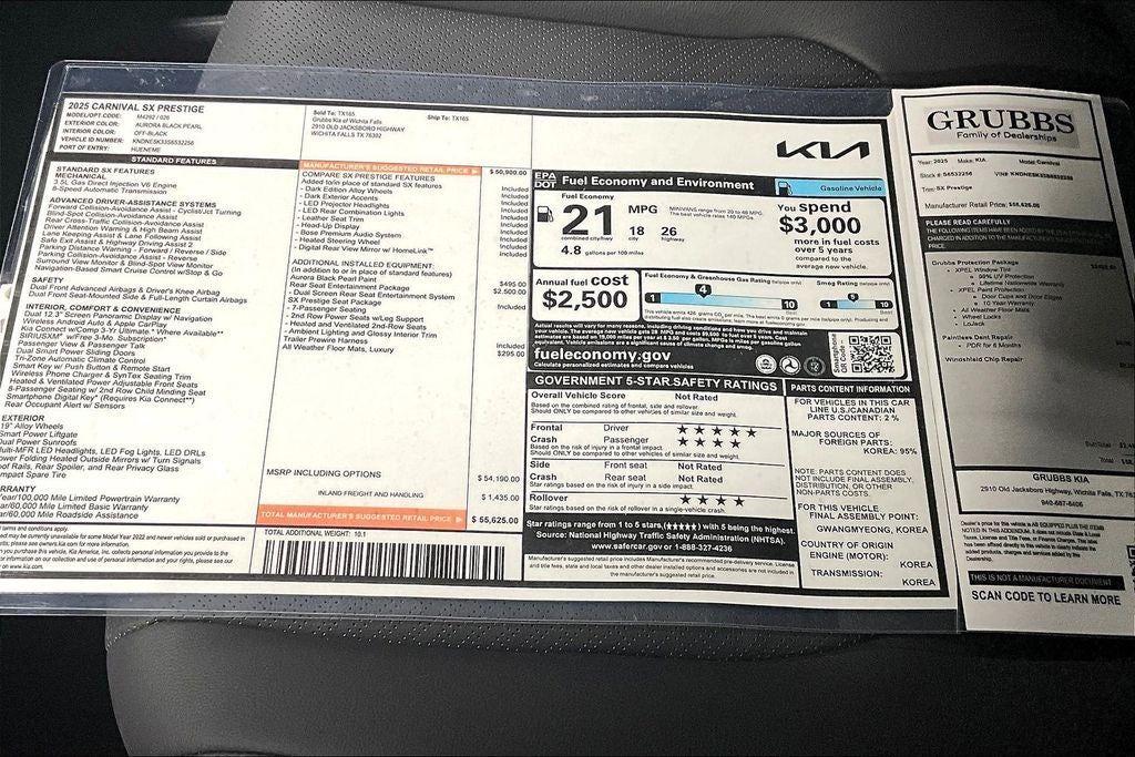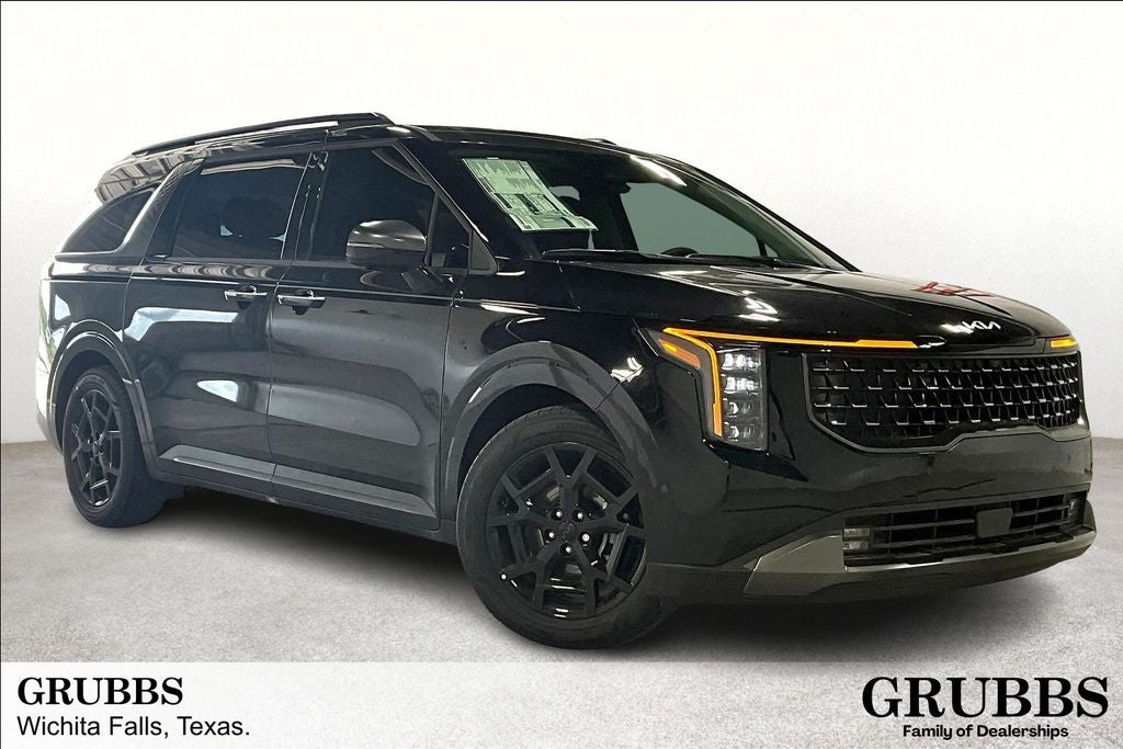 2025 Kia Carnival SX Prestige 4D Passenger Van SX Prestige Aurora Black Pearl FWD 8-Speed Automatic V6 Carnival SX Prestige, 4D Passenger Van, V6, 8-Speed Automatic, FWD, Aurora Black Pearl, Off-Black Leather, 12 Speakers, 2nd Row Laminated Windows, 3rd row seats: split-bench, 4-Wheel Disc Brakes, ABS brakes, Air Conditioning, AM/FM radio: SiriusXM, Ambient Lighting, Apple CarPlay & Android Auto, Auto-dimming Rear-View mirror, Automatic temperature control, Compass, Driver door bin, Driver vanity mirror, Dual front impact airbags, Dual Screen Rear Seat Entertainment System, Emergency communication system, Front Bucket Seats, Front Center Armrest, Front dual zone A/C, Front reading lights, Garage door transmitter: HomeLink, Heads-Up Display, Heated & Ventilated Front Bucket Seats, Heated door mirrors, Heated front seats, Heated steering wheel, Heated/Ventilated 2nd Row Power VIP Lounge Seats, High Glossy Interior Trim, Knee airbag, Memory seat, Navigation system: AVN 5.0 Navigation System, Occupant sensing airbag, Power 2nd-Row Moonroof, Power door mirrors, Power driver seat, Power moonroof, Power passenger seat, Power steering, Power windows, Pure Leather Seat Trim, Radio: AM/FM/HD Audio System, Rear air conditioning, Rear Seat Entertainment Package, Rear window defroster, Reclining 3rd row seat, Remote keyless entry, Split folding rear seat, Spoiler, Steering wheel mounted audio controls, SX Prestige Seat Package, Telescoping steering wheel, Turn signal indicator mirrors, Ventilated front seats.