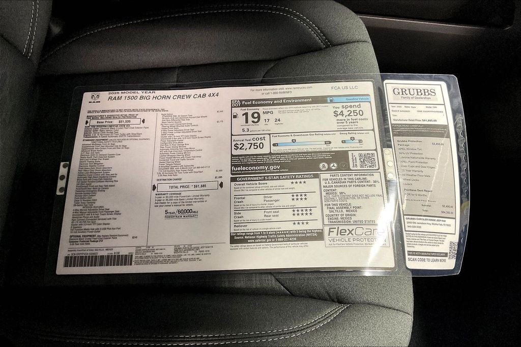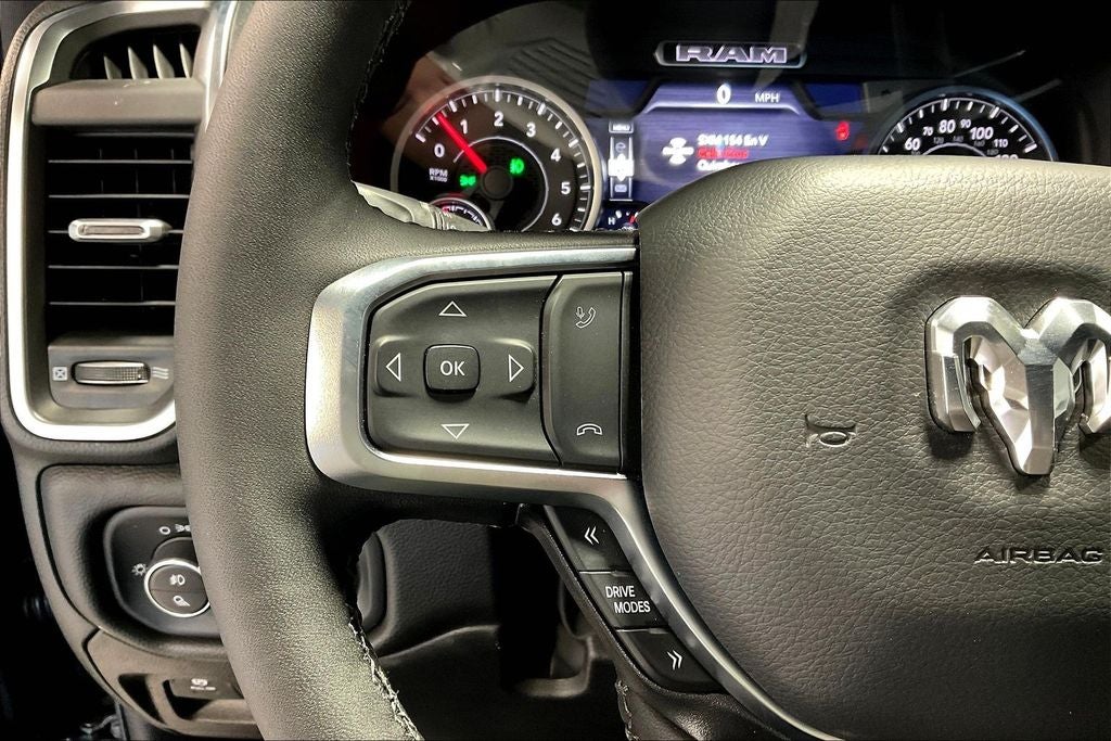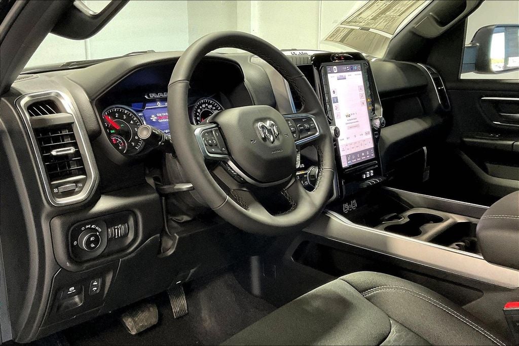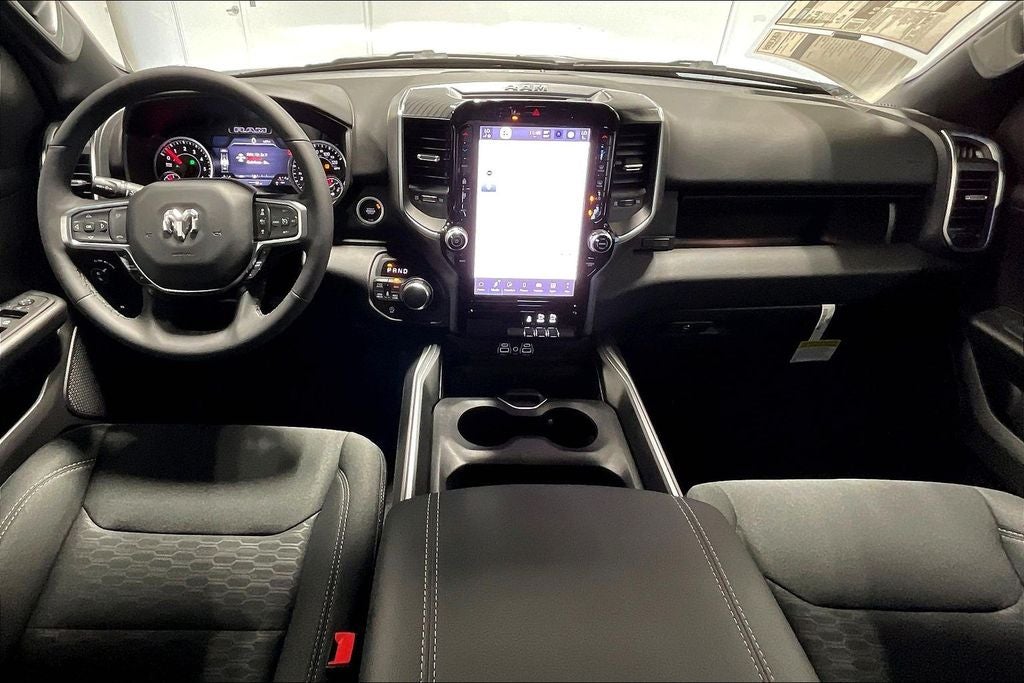 2025 Ram 1500 Big Horn/Lone Star 4D Crew Cab Big Horn/Lone Star Diamond Black Crystal Pearlcoat 4WD 8-Speed Automatic 3.0L I6 115V Auxiliary Power Outlet, 115V Auxiliary Rear Power Outlet, 12 Touchscreen Display, 2nd Row In Floor Storage Bins, 3 Rear Seat Head Restraints, 4 Way Front Headrests, 400W Inverter, 4G LTE Wi-Fi Hot Spot, 9 Amplified Speakers w/Subwoofer, Accent Color Door Handles, Accent Color Premium Power Mirrors, Accent Color Tailgate Handle, Air Conditioning ATC w/Dual Zone Control, Anti-Spin Differential Rear Axle, Apple CarPlay, Apple CarPlay/Android Auto, Auto Power-Folding Mirrors, Auto-Dimming Exterior Driver Mirror, Auto-Dimming Rear-View Mirror, Big Horn Level 2 Equipment Group, Black Exterior Mirrors, Black Exterior Truck Badging, Black Headlamp Bezels, Black Interior Accents, Black Painted Exterior Mirrors Caps, Black Premium Power Mirrors, Black Tail Lamp Bezels, Body Color Front Bumper, Body Color Rear Bumper w/Step Pads, Bucket Seats, Cluster 7.0 TFT Color Display, Compass, Configurable Drive Mode, Connected Travel & Traffic Services, Connectivity - US/Canada, Convex Wide-Angle Exterior Mirror Insert, Deluxe Cloth Bucket Seats, Exterior Mirrors Courtesy Lamps, Exterior Mirrors w/Heating Element, Exterior Mirrors w/Supplemental Signals, Front reading lights, Front Seat Back Map Pockets, Full Length Floor Console, Glove Box Lamp, Google Android Auto, GPS Antenna Input, GPS Navigation, Grille Black Surround Black Mesh, HD Radio, Heated Front Seats, Heated Steering Wheel, Integrated Voice Command w/Bluetooth®, Leather Wrapped Steering Wheel, LED Dome Lamp w/On/Off Switch, LED Footwell Lighting, Manual Adjust 4-Way Front Passenger Seat, Media Hub w/2 Charge Only USBs, Night Edition, Overhead LED Lamps, Power 2-Way Driver Lumbar Adjust, Power Adjust 8-Way Driver Seat, Power Adjustable Pedals, Power steering, Power windows, Premium Overhead Console, Quick Order Package 21Z Big Horn, Radio: Uconnect 5 Nav w/12.0 Display, RAM Grille Badge - Black, Rear 60/40 Folding Seat, Rear Center Armrest, Rear Power Sliding Window, Rear Window Defroster, Remote Tailgate Release, Security Alarm, SiriusXM w/360L, Steering Wheel Mounted Audio Controls, Sun Visors w/Illuminated Vanity Mirrors, Tachometer, Telescoping steering wheel, Tilt steering wheel, Universal Garage Door Opener, USB Host Flip, Wheels: 20 x 9.0 Aluminum Painted Clad.