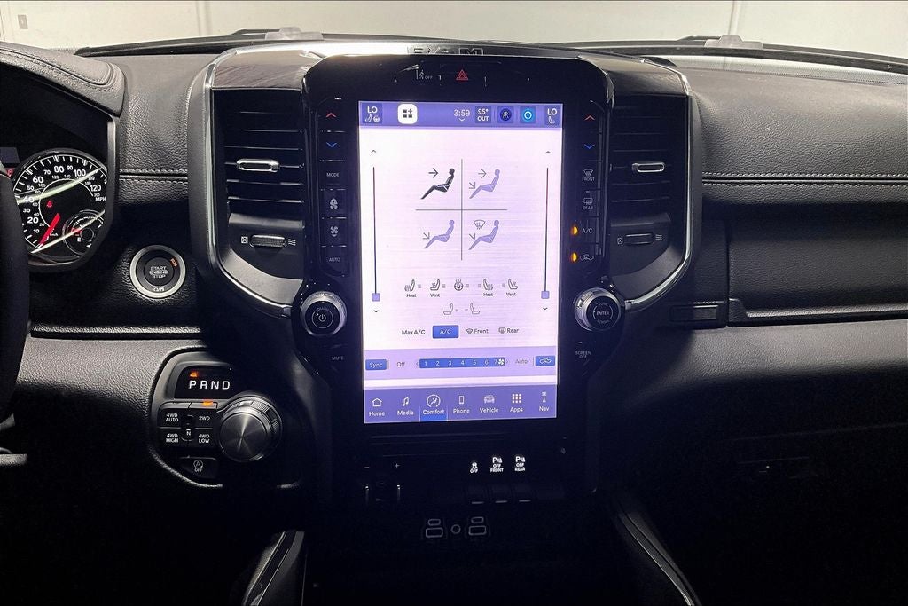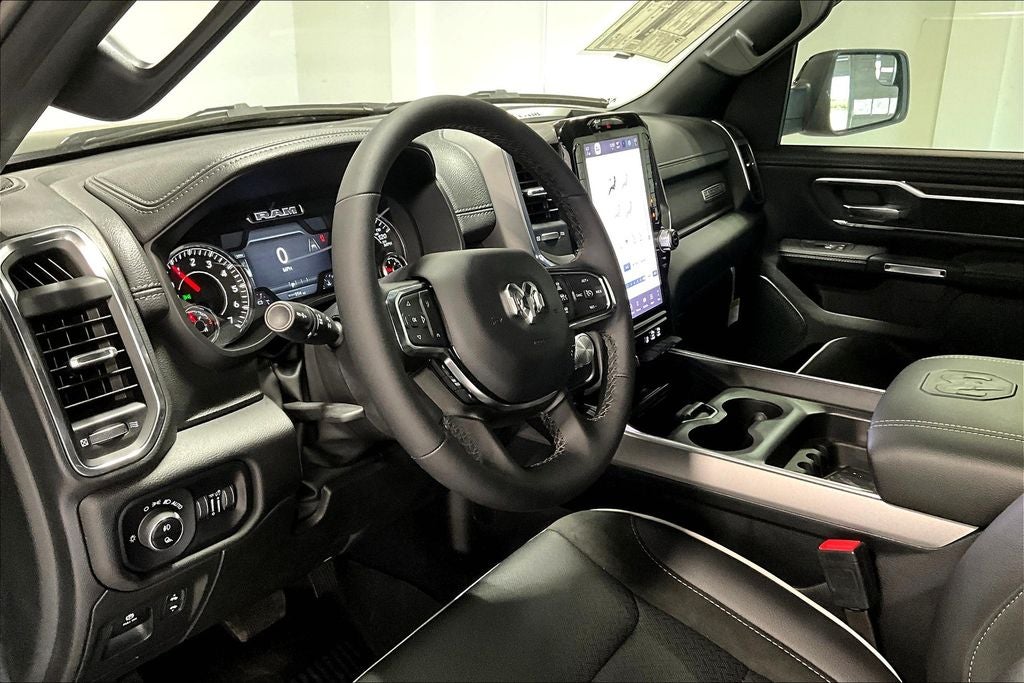 2025 Ram 1500 Laramie 4D Crew Cab Laramie Diamond Black Crystal Pearlcoat 4WD 8-Speed Automatic 3.0L I6 1500 Laramie, 4D Crew Cab, 3.0L I6, 8-Speed Automatic, 4WD, Diamond Black Crystal Pearlcoat, Black Leather, 10 Speakers, 3 Rear Seat Head Restraints, 33 Gallon Fuel Tank, 4 Way Front Headrests, 4-Wheel Disc Brakes, 4G LTE Wi-Fi Hot Spot, ABS brakes, Accent Color Premium Power Mirrors, Air Conditioning, AM/FM radio: SiriusXM with 360L, Apple CarPlay, Apple CarPlay/Android Auto, Audio memory, Auto High-beam Headlights, Auto Power-Folding Mirrors, Auto-Dimming Exterior Driver Mirror, Auto-dimming Rear-View mirror, Automatic temperature control, Black Painted Exterior Mirrors Caps, Body Color Front Bumper, Body Color Rear Bumper w/Step Pads, Brake assist, Compass, Connected Travel & Traffic Services, Connectivity - US/Canada, Convex Wide-Angle Exterior Mirror Insert, Dome Dual LED Reading Lamp, Driver Seat Memory, Dual front impact airbags, Dual front side impact airbags, Dual-Pane Panoramic Sunroof, Electronic Stability Control, Exterior Mirrors Courtesy Lamps, Exterior Mirrors w/Heating Element, Exterior Mirrors w/Memory, Exterior Mirrors w/Supplemental Signals, Front anti-roll bar, Front dual zone A/C, Front License Plate Bracket, Front reading lights, Front wheel independent suspension, Garage door transmitter, Google Android Auto, GPS Antenna Input, GPS Navigation, Grille Surround 3 Body Color Tex 4 Chrome, HD Radio, Heated Front Seats, Heated front seats, Heated rear seats, Heated Steering Wheel, Heated steering wheel, Illuminated entry, Integrated Voice Command w/Bluetooth®, Laramie Level 1 Equipment Group, Laramie Southwest Edition, Leather steering wheel, Leather Trim 40/20/40 Bench Seat, LED Dome/Reading Lamp, Low tire pressure warning, Memory seat, MOPAR Front & Rear Rubber Floor Mats, Navigation System, Outside temperature display, Overhead console, Panic alarm, ParkView Rear Back-Up Camera, Power 2-Way Driver Lumbar Adjust, Power 2-Way Passenger Lumbar Adjust, Power Deployable Running Boards, Power driver seat, Power steering, Power windows, Quick Order Package 21H Laramie, Radio data system, Radio: Uconnect 5 Nav w/12.0 Display, Rain Sensitive Windshield Wipers, RAM Grille Badge - Chrome, Remote keyless entry, Remote Tailgate Release, SiriusXM w/360L, Steering wheel mounted audio controls, Tachometer, Telescoping steering wheel, Tilt steering wheel, Tow Hooks, Trailer Brake Control, Trip computer.