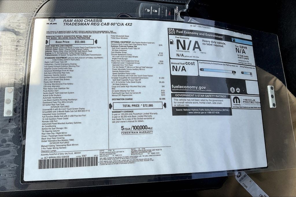 2025 Ram 4500HD Tradesman 2D Standard Cab Tradesman Diamond Black Crystal Pearlcoat RWD 8-Speed Automatic Cummins 6.7L I6 Turbodiesel 4500HD Tradesman, 2D Standard Cab, Cummins 6.7L I6 Turbodiesel, 8-Speed Automatic, RWD, Diamond Black Crystal Pearlcoat, Diesel Gray/Black Vinyl, 19.5 x 6.0 Steel Wheels, 4 Speakers, 4-Wheel Disc Brakes, 4G LTE Wi-Fi Hot Spot, ABS brakes, Air Conditioning, AM/FM radio: SiriusXM, Apple CarPlay, Apple CarPlay/Android Auto, Black Exterior Mirrors, Bright Front Bumper, Cargo & CHMSL Lamp, Center Hub, Chrome Appearance Group, Chrome Grille Surround, Cold Weather Group, Compass, Connectivity - US/Canada, Delay-off headlights, Dual rear wheels, Electronic Stability Control, Engine Block Heater, Exterior Mirrors Courtesy Lamps, Exterior Mirrors w/Heating Element, Exterior Mirrors w/Supplemental Signals, Front 1-Touch Down Power Windows, Front anti-roll bar, Front fog lights, Fully automatic headlights, GPS Antenna Input, Heavy Duty Front Suspension Group, Manual DPF Regeneration, Manual Folding Exterior Mirrors, Manual Telescoping Mirrors, Matte Black Mesh Grille w/Chrome, Mirror Power Heat Fold Telescope Black, Mirror Running Lights, MOPAR Winter Front Grille Cover, Occupant sensing airbag, Power Adjust Mirrors, Power-Adjustable Convex Aux Mirrors, Quick Order Package 25A Tradesman, Radio data system, Radio: Uconnect 5 w/8.4 Display, Rear Window Defroster, Remote Keyless Entry, Remote USB Port - Charge Only, Speed control, Speed Sensitive Power Locks, Tradesman Level 1 Equipment Group, Trailer Brake Control, Trailer Light Check, Upgraded Door Trim Panel, Voltmeter.