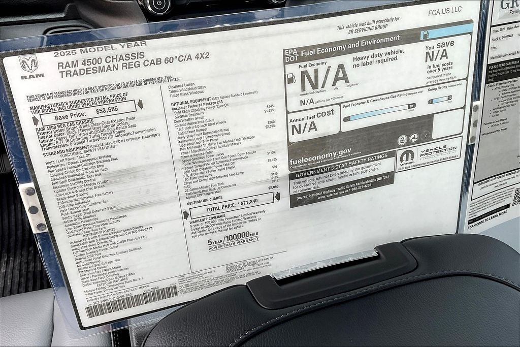 2025 Ram 4500HD Tradesman 2D Standard Cab Tradesman Bright White Clearcoat RWD 8-Speed Automatic Cummins 6.7L I6 Turbodiesel 4500HD Tradesman, 2D Standard Cab, Cummins 6.7L I6 Turbodiesel, 8-Speed Automatic, RWD, Bright White Clearcoat, Diesel Gray/Black Vinyl, 19.5 x 6.0 Steel Wheels, 4 Speakers, 4G LTE Wi-Fi Hot Spot, Air Conditioning, AM/FM radio: SiriusXM, Apple CarPlay, Apple CarPlay/Android Auto, Black Exterior Mirrors, Bright Front Bumper, Cargo & CHMSL Lamp, Center Hub, Chrome Appearance Group, Chrome Grille Surround, Cold Weather Group, Engine Block Heater, Exterior Mirrors Courtesy Lamps, Exterior Mirrors w/Heating Element, Exterior Mirrors w/Supplemental Signals, Front 1-Touch Down Power Windows, Front License Plate Bracket, GPS Antenna Input, Manual DPF Regeneration, Manual Folding Exterior Mirrors, Manual Telescoping Mirrors, Matte Black Mesh Grille w/Chrome, Mirror Power Heat Fold Telescope Black, Mirror Running Lights, MOPAR Winter Front Grille Cover, Power Adjust Mirrors, Power-Adjustable Convex Aux Mirrors, Quick Order Package 25A Tradesman, Radio data system, Radio: Uconnect 5 w/8.4 Display, Rear Window Defroster, Remote Keyless Entry, Speed Sensitive Power Locks, Tradesman Level 1 Equipment Group, Trailer Brake Control, Trailer Light Check, Upgraded Door Trim Panel.