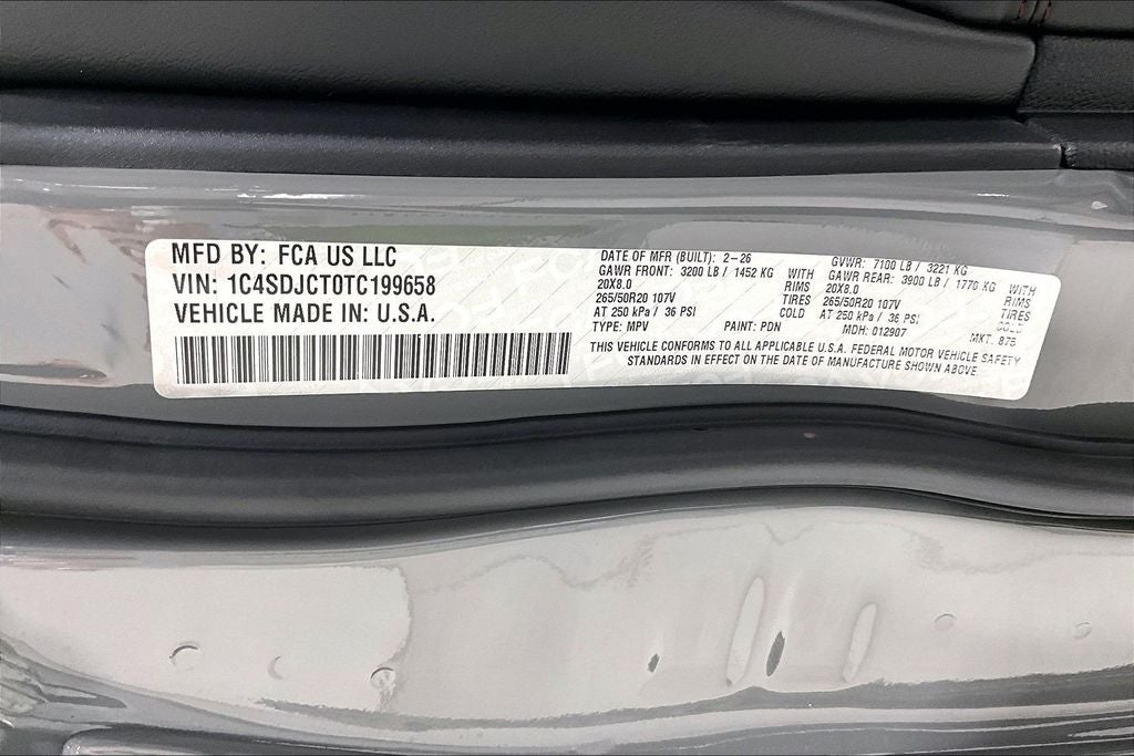 Recent Arrival! 2026 Dodge Durango GT Plus HEMI V8 4D Sport Utility GT Plus HEMI V8 Destroyer Gray Clearcoat AWD 8-Speed Automatic HEMI 5.7L V8 Multi Displacement VVT Durango GT Plus HEMI V8, 4D Sport Utility, HEMI 5.7L V8 Multi Displacement VVT, 8-Speed Automatic, AWD, Destroyer Gray Clearcoat, Black, 115V Auxiliary Power Outlet, 2nd Row Fold/Tumble Captain Chairs, 2nd Row Mini Console with Cupholders, 2nd Row Seat Mounted Inboard Armrests, 3rd Row Floor Mat and Mini Console, 6-Passenger Seating, 7 and 4 Pin Wiring Harness, 9 Speakers, Adaptive Cruise Control with Stop, Air Conditioning, Alloy wheels, AM/FM radio: SiriusXM w/360L, Apple CarPlay/Android Auto, Auto High Beam Headlamp Control, Auto-Dimming Exterior Driver Mirror, Black Dodge Grille Badge, Black Roof Rails, Blacktop Leather SRT Performance Seats, Blacktop Redline Package, Blind Spot with Trailer Detection, Cargo Net, Class IV Receiver Hitch, Compass, Crypto Sweep Etch Accents, Delay-off headlights, Dual Remote USB Port - Charge Only, Exterior Mirrors with Heating Element, Exterior Mirrors with Memory, Exterior Mirrors with Supplemental Signals, Floor Console with Leather Armrest, Front Bucket Seats, Front dual zone A/C, Full Speed Forward Collision Warning Plus, Gloss Black Badges, Gloss Black Exterior Mirrors, Heated front seats, Heated Second Row Seats, Integrated Roof Rail Crossbars, Leather Trimmed Bucket Seats, Leather Wrapped Door Panels, LED Auxiliary Low Beam and Turn Signal, MOPAR All Weather Package, MOPAR Front and Rear Door Entry Guards, MOPAR Slush Mats, Navigation System, Panic alarm, Performance Lower Splitter, Power 6x9 Multi-Function Foldaway Mirrors, Power 8-Way Driver Memory 8-Way Passenger Seats, Power driver seat, Power Driver/Passenger 4-Way Lumbar Adjust, Power steering, Power Sunroof, Power Tilt and Telescopic Steering Column, Power windows, Premium Door Trim Panel, Premium Instrument Panel, Quick Order Package 22T GT Plus, Radio data system, Radio: Uconnect 5 Nav with 10.1 Display, Radio/Driver Seat/Mirrors Memory, Rear air conditioning, Red Accent Stitching, Remote keyless entry, Satin Black Dodge Tail Lamp Badge, SRT Rear Spoiler, Telescoping steering wheel, Tilt steering wheel, Trailer Brake Control, Ventilated Front Seats, Wheels: 20 x 8 Black Noise Split 5-Spoke.