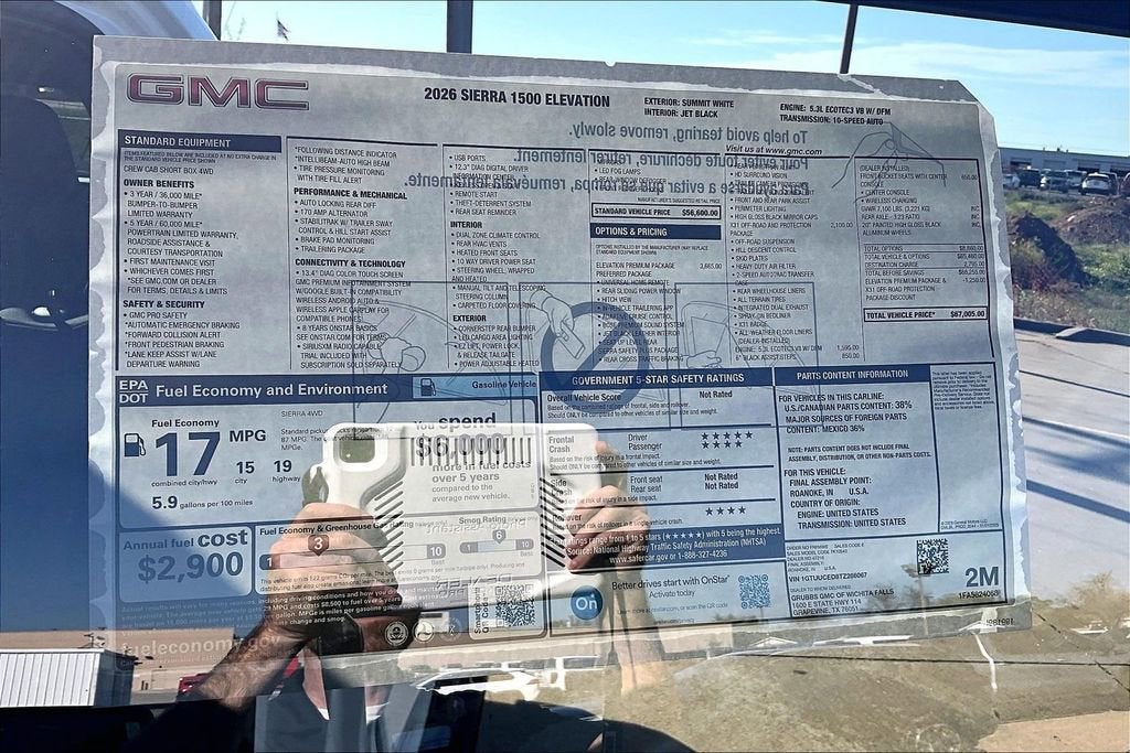 Summit White 2026 GMC Sierra 1500 EcoTec3 5.3L V8 10-Speed Automatic 4WD Elevation 10-Speed Automatic, 4WD, Black Leather.