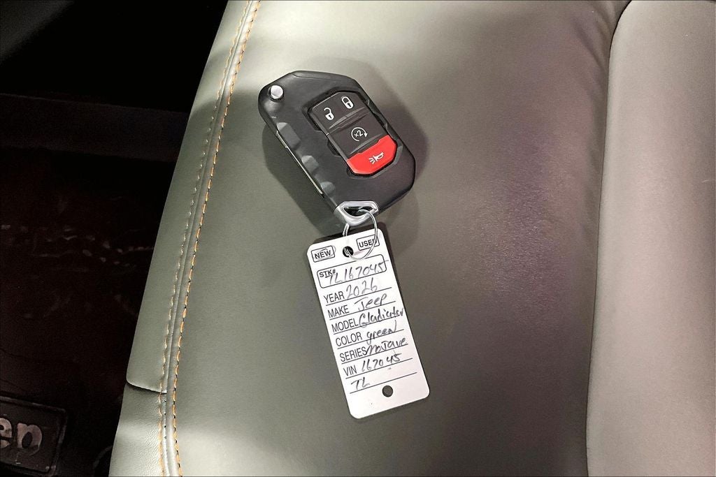 Recent Arrival! 2026 Jeep Gladiator Mojave 4D Crew Cab Mojave anvil clearcoat 4WD 8-Speed Automatic 3.6L V6 24V VVT New Feature, Apple CarPlay / Android Auto, Backup camera, Bluetooth®, Heated seats, Leather seats, Navigation system, Remote Start, Gladiator Mojave, 4D Crew Cab, 3.6L V6 24V VVT, 8-Speed Automatic, 4WD, anvil clearcoat, Black Leather, 110 Mph Vehicle Max Speed Calibration, 12.3 Touchscreen Display, 4-Wheel Disc Brakes, 4.10 Rear Axle Ratio, 4G LTE Wi-Fi Hot Spot, 8 Speakers, ABS brakes, Air Conditioning, Alexa Built-in, Alloy wheels, Alpine Premium Audio System, AM/FM radio: SiriusXM with 360L, Apple CarPlay, Apple CarPlay/Android Auto, Auto High Beam Headlamp Control, Auto-Dimming Rear-View Mirror, Automatic temperature control, Blind Spot and Cross Path Detection, Bluetooth® Wireless Speaker, Body Color 3-Piece Hard Top, Body Color Rubicon Highline Flare, Brake assist, Compass, Connectivity - US/Canada, Delay-off headlights, Driver door bin, Driver vanity mirror, Dual front impact airbags, Dual front side impact airbags, Electronic Stability Control, Emergency communication system: Jeep Connect, Freedom Panel Storage Bag, Front anti-roll bar, Front Bucket Seats, Front Center Armrest w/Storage, Front dual zone A/C, Front fog lights, Front License Plate Bracket, Front reading lights, Full Length Floor Console Premium Armrest, Fully automatic headlights, Google Android Auto, Heated door mirrors, Heated Front Seats, Heated Steering Wheel, Heavy Duty Suspension with Gas Shocks, Illuminated entry, Integrated Off-Road Camera, Integrated roll-over protection, Integrated Voice Command with Bluetooth®, Leather Trimmed Bucket Seats, Leather Wrapped Park Brake Handle, Leather Wrapped Shift Knob, Low tire pressure warning, Mojave Top Hood Decal, MOPAR All-Weather Slush Mats, MOPAR Hardtop Headliner, MOPAR Spray in Bedliner, Occupant sensing airbag, Outside temperature display, Overhead airbag, Panic alarm, ParkSense Rear Park Assist System, Passenger door bin, Passenger vanity mirror, Power 4-Way Driver Lumbar Adjust, Power 4-Way Passenger Lumbar Adjust, Power Adjust 8-Way Driver Seat, Power Adjust 8-Way Front Passenger Seat, Power door mirrors, Power steering, Power windows, Premium Cloth Seats with Sport Bolsters, Premium Door Trim Panel, Quick Order Package 24A Mojave X, Radio data system, Radio: Uconnect 5 Navigation with 12.3 Display, Radio: Uconnect 5 with 12.3 Display, Rear anti-roll bar, Rear Armrest with Cupholder Seat, Rear reading lights, Rear Sliding Window, Rear Window Defroster, Remote keyless entry, Security system, Speed control, Split folding rear seat, Steel Front Bumper, Steel Rear Bumper, Steering wheel mounted audio controls, Tachometer, Telescoping steering wheel, Tilt steering wheel, Traction control, Trip computer, Universal Garage Door Opener, USB Host Flip, Variably intermittent wipers, Voltmeter, Wheels: 17 x 7.5 Dark Gray Painted. Price includes: $1000 - 2026 National Retail Bonus Cash . Exp. 04/30/2026