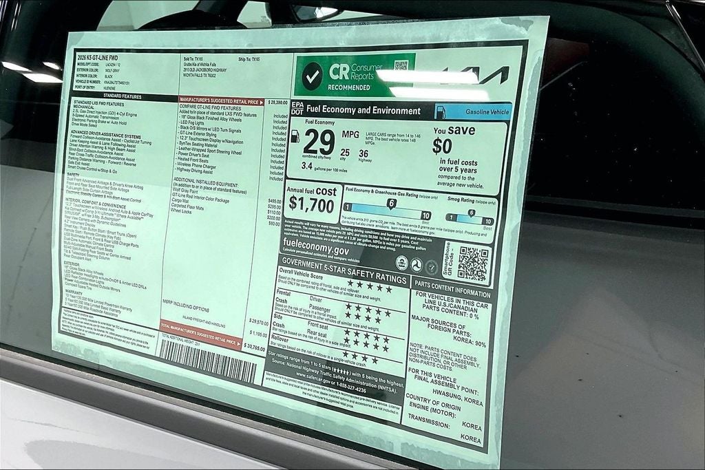 New Price! Recent Arrival! 2026 Kia K5 GT-Line 4D Sedan GT-Line Wolf Gray 8-Speed Automatic I4 K5 GT-Line, 4D Sedan, I4, 8-Speed Automatic, Red Leather, 4-Wheel Disc Brakes, ABS brakes, Air Conditioning, Automatic temperature control, Dual front impact airbags, Emergency communication system: Kia Connect (includes 1 year free trial), Four wheel independent suspension, Front Bucket Seats, Front Center Armrest, GT-Line Red Interior Package, Heated Front Bucket Seats, Heated front seats, Knee airbag, Navigation System, Power driver seat, Power steering, Power windows, Remote keyless entry, Speed-sensing steering, Steering wheel mounted audio controls, SynTex Seat Trim. Price includes: $1000 - KFA Dealer Choice Program: $1000 discount and 5.25% APR for 36 months. $30.08 per $1000 financed. Available to well qualified buyers who finance through Kia Finance America. 506. Exp. 03/02/2026