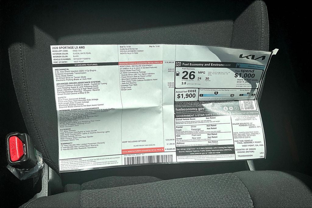 2026 Kia Sportage LX 4D Sport Utility LX Glacial White Pearl AWD 8-Speed Automatic I4 Sportage LX, 4D Sport Utility, I4, 8-Speed Automatic, AWD, Glacial White Pearl, Black Cloth, 4-Wheel Disc Brakes, 6 Speakers, ABS brakes, Air Conditioning, Alloy wheels, AM/FM radio, Blind Spot Collision Warning, Brake assist, Cargo Cover, Delay-off headlights, Dual front impact airbags, Dual front side impact airbags, Electronic Stability Control, Four wheel independent suspension, Front anti-roll bar, Front Bucket Seats, Front Center Armrest, Heated Front Bucket Seats, Heated Outside Mirrors w/LED Turn Signal Indicators, LX Convenience Package, Overhead airbag, Power steering, Power windows, Radio: AM/FM/HD Audio System, Rear side impact airbag, Rear window defroster, Remote keyless entry, Security system, Speed-sensing steering, Split folding rear seat, Steering wheel mounted audio controls, Traction control, Wheel Locks.