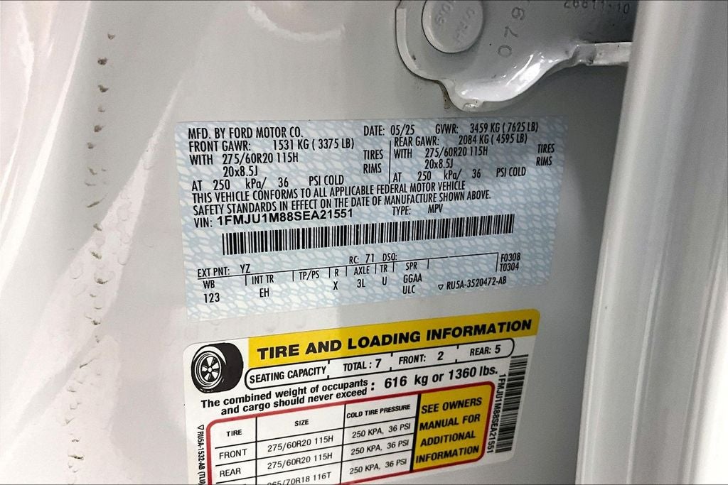 2025 Ford Expedition Platinum Platinum Oxford White 4D Sport Utility 4WD EcoBoost 3.5L V6 GTDi DOHC 24V Twin Turbocharged 10-Speed Automatic Expedition Platinum, 4D Sport Utility, EcoBoost 3.5L V6 GTDi DOHC 24V Twin Turbocharged, 10-Speed Automatic, 4WD, Oxford White, Black Onyx Leather, 10 Speakers, 2nd Row Power-Folding Captain's Chairs, 4-Wheel Disc Brakes, ABS brakes, Air Conditioning, Alloy wheels, AM/FM radio: SiriusXM with 360L, Brake assist, Compass, Dual front impact airbags, Equipment Group 600A Standard Package, Front Bucket Seats, Front Center Armrest, Heated front seats, Heated rear seats, Navigation System, Power moonroof: Vista Roof, Power passenger seat, Power steering, Power windows, Radio data system, Radio: B&O Sound System by Bang & Olufsen, Remote keyless entry, SiriusXM w/360L, Split folding rear seat, Steering wheel memory.
